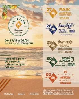 Os ingressos para o “Let’s Pipa” estão esgotados. Já o “Let’s Boat” apenas a segunda (31) está disponível para venda. O “Let’s Club” também está com ingressos disponíveis para todos os dias.